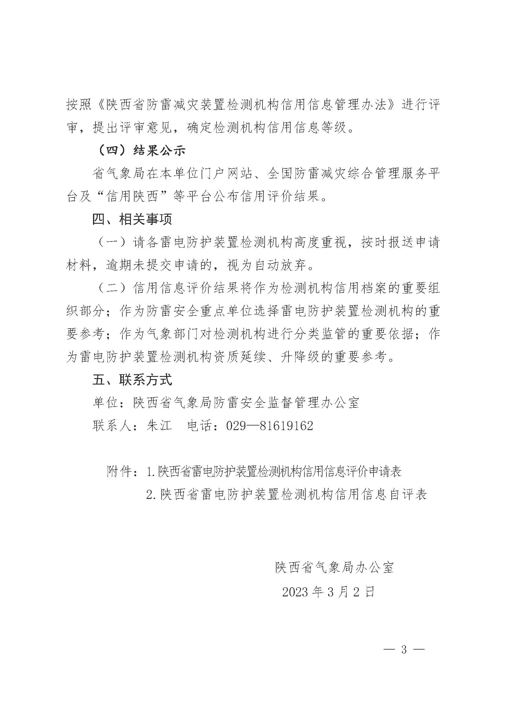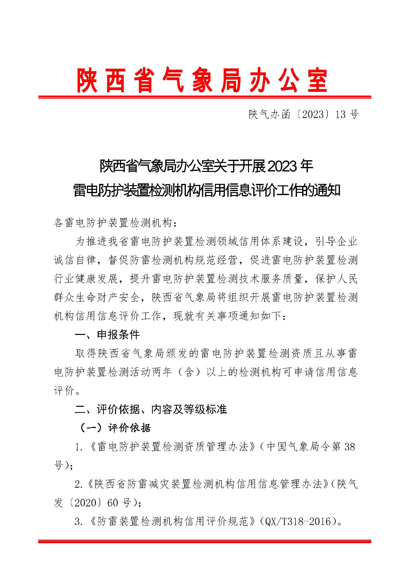 陜西省氣象局辦公室關(guān)于開展2023年雷電防護(hù)裝置檢測(cè)機(jī)構(gòu)信用信息評(píng)價(jià)工作的通知